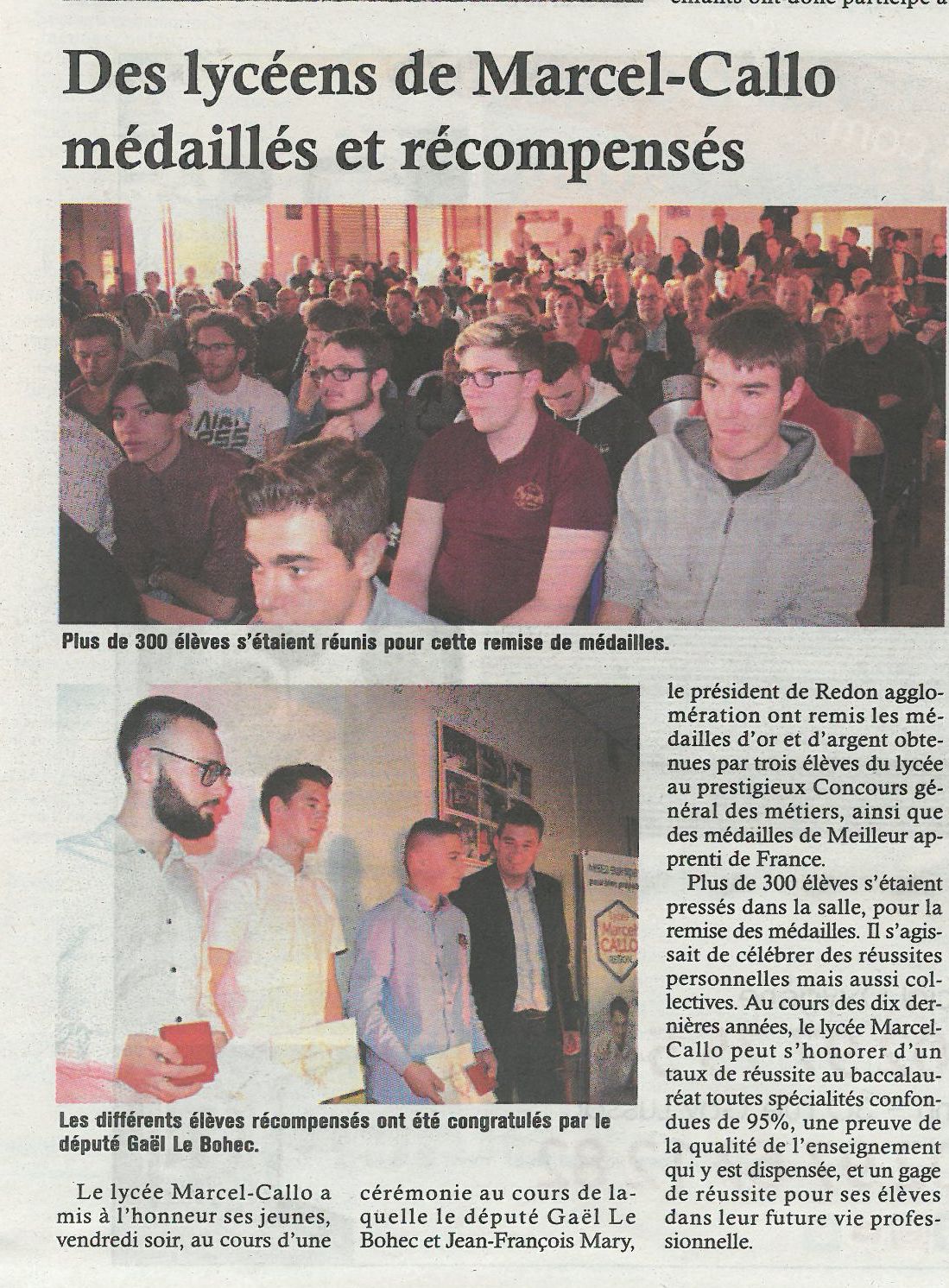 Le député M. Le Bohec et M. Mary, président de l’Agglomération de Redon ont remis les médailles aux lauréats du concours général des métiers et du concours des Meilleurs Apprentis de France. Cette année, 3 élèves ont été récompensés au Concours Général des Métiers au niveau national : 2 médailles d’or (en Usinage et en Automobile) et 1 de bronze (en Usinage). Pour le concours Meilleurs Apprentis de France, 8 élèves ont été récompensés dans les secteur de l’Aéronautique, de l’Electrotechnique, de la Maintenance industrielle, de l’Usinage : 5 médailles d’or et 3 d’argent. Puis tous les lycéens et étudiants ont été appelés pour être félicités et recevoir leur diplôme de CAP, de BAC, ou de BTS. Le directeur a également remis la médaille d’honneur du Lycée aux 12 élèves ayant obtenu la mention très bien au BAC. Ce fut une très belle soirée festive, pendant laquelle les professeurs ont été heureux de revoir leurs anciens élèves.