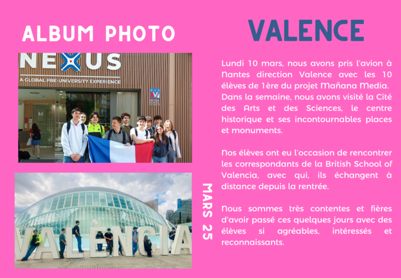 Ils ont eu l’occasion aussi de visiter l’entreprise VERSA, le Musée des Sciences, l’Océnaographic (le plus grand aquarium d’Europe), le Musée Fallero, les lycées Comenius (partenaire du lycée), le British School of Valencia. Ils reviennent plein de souvenirs.