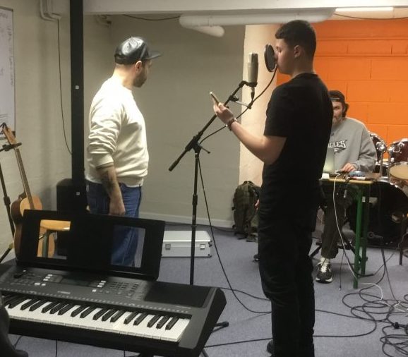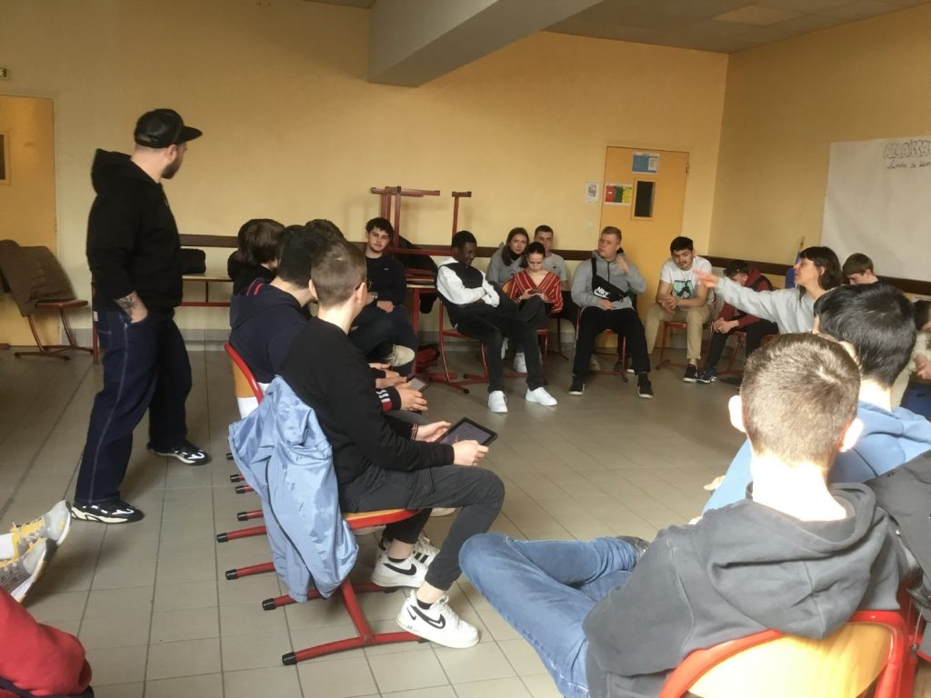Nous avons accueilli Emmanuelle, Nicolas et Loïc de la compagnie « L’Unijambiste » afin de poursuivre les ateliers artistiques autour du projet « Education Nationale » avec la classe de 1PV. L’objectif principal de cette session était d’enregistrer les textes écrits par les élèves. Nous sommes satisfaits puisque celui-ci a été atteint !